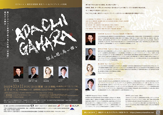 人気作曲家 加藤昌則の音楽に、篠崎“まろ”史紀(ヴァイオリン)、森谷真理(ソプラノ)、金子平(クラリネット)を得て、能「安達原」に切り込み、武田宗典(シテ)が火花を散らし、今までに見たことも聞いたこともない空間・時間を創造します。東京アート&ライブシティでは、王子ホールと観世能楽堂のコラボレーション企画第1弾として2019年「はごろも」(王子ホール)と2020年(観世能楽堂)で上演しました。「ADACHIGAHARA」はその第2弾で、今春、観世能楽堂で上演、秋に王子ホールでの開催となります。4年の積み重ねを経て、王子ホールに場を移し、更なる熟成した作品に・・・どうぞご期待を。
